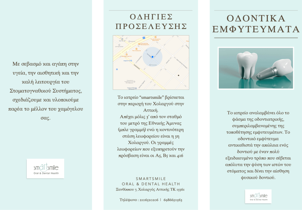 Το οδοντιατρείο Smartsmile βρίσκεται στον Χολαργό Αττικής και προσφέρει υπηρεσίες γενικής οδοντιατρικής, αισθητικής δοντιών, παιδοδοντιατρικής καθώς και την τοποθέτηση εμφυτευμάτων. Επιπλέον εξυπηρετεί γαλλόφωνους, αγγλόφωνους και ισπανόφωνους ασθενείς.